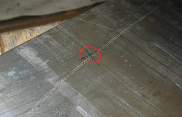 I center punched the dot and got out my measuring tools. Using the engineering drawing of the motor to get the correct radius, 3.325 inches, I drew a circle centered on the red dot punch mark. I used the properties of a right triangle to figure out the distance between the bolt holes: 4.702 inches.