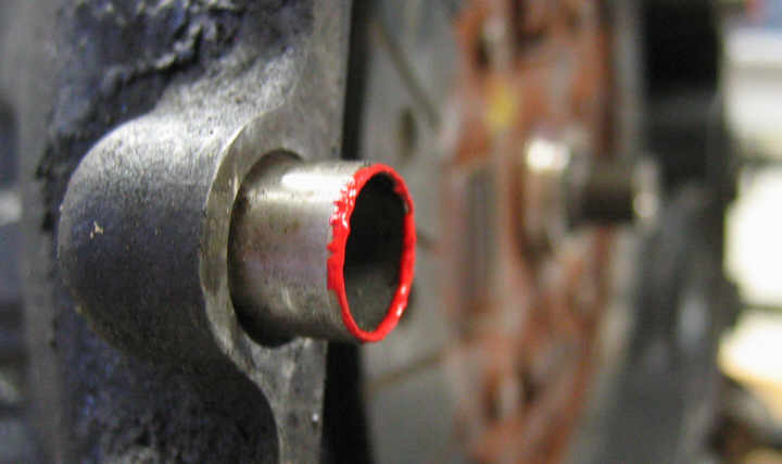 Now I can find the center point of the transaxle shaft. I used my handy caliper to measure the inside diameter of the hole in the pilot shaft and turned an old bolt down to the correct diameter on the lathe. Then I cut a little tip at the end on which I will dab some paint: