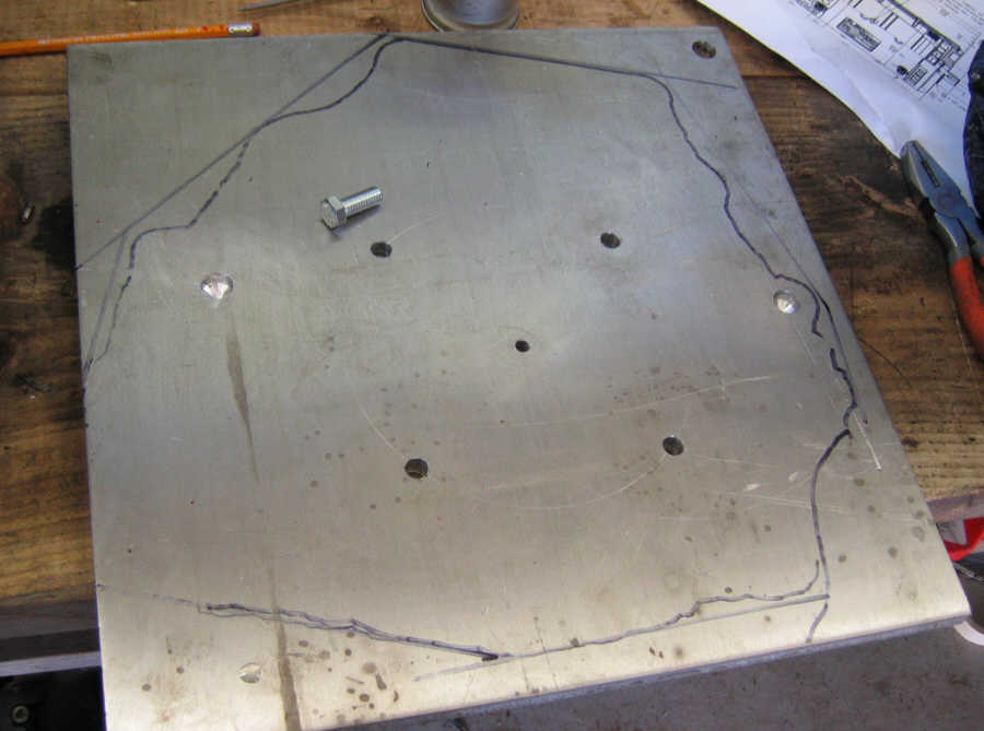 So I drilled the four mounting holes and drew a rough outline of the transaxle case on the plate: