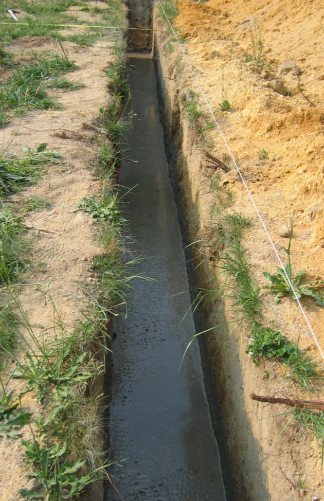 The concrete arrived at 3 PM. The driver appraised the situation, then shot concrete into the trench. It took about an hour, concrete rushing like a river down the chute into the trenches. He called the mix self-leveling. OK! Here is the west trench, concrete glisstening in the afternoon sun: