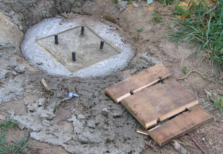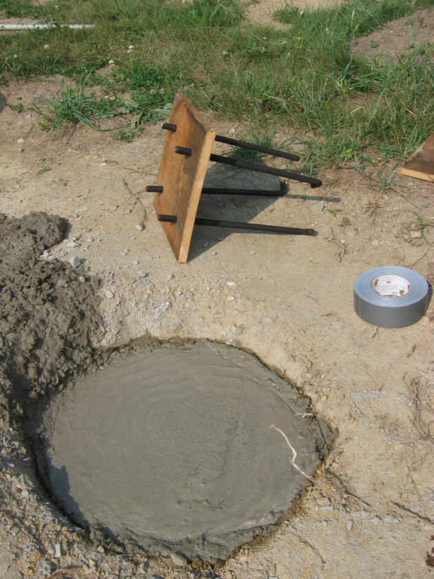After the pour, I cut and drilled a jig to hold the J-bolts for the center piers. The lally columns will be attached to the piers using these. Below the jig is the pier hole filled with concrete. To the right is the trusted friend of the weekend warrior, a roll of duct tape: