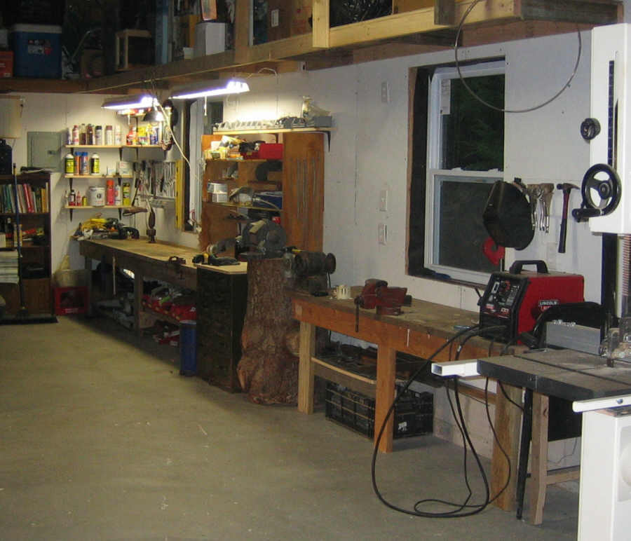 October 2008. Another bench (for welding) and more shelving installed. These shelves are 3/4" plywood left over from flooring, so I put fewer supports underneath: