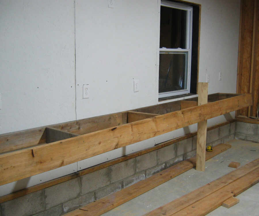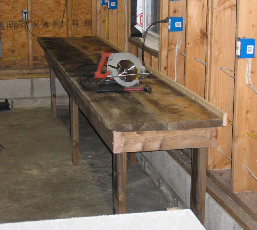 March 23. When I finished the south interior wall, I built a workbench against that wall. I snapped a chalk line high enough to miss the lower outlets:
