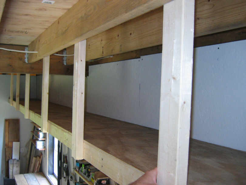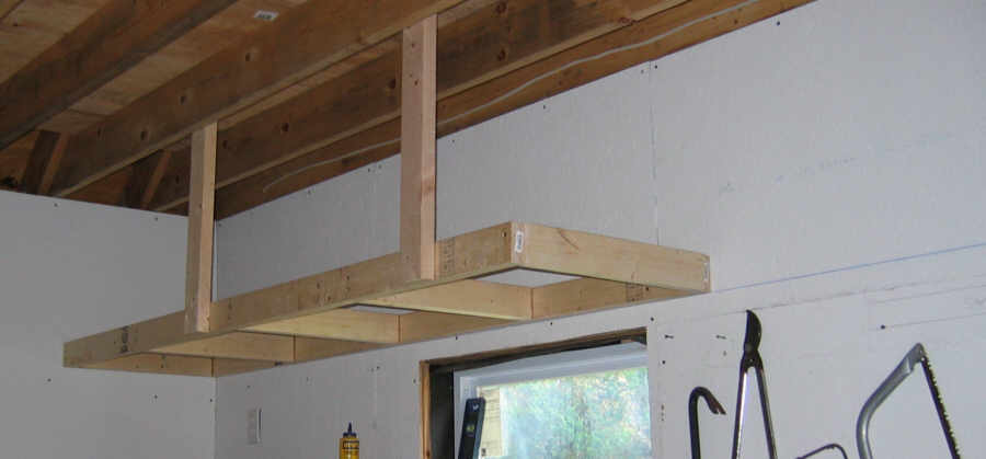 July 3. I would like to have mezzanine shelves around the garage. Here is the first one, along the south wall. I nailed together a 2' x 8' frame out of 2x4's, then screwed two uprights to the front. I measured the width of the frame (23 3/4") so that the uprights would screw right into the ceiling joists. I made the height 20" so standard storage containers would fit. Here is the first section in place, nailed into the studs along the walls. Note the level blue chalk line: