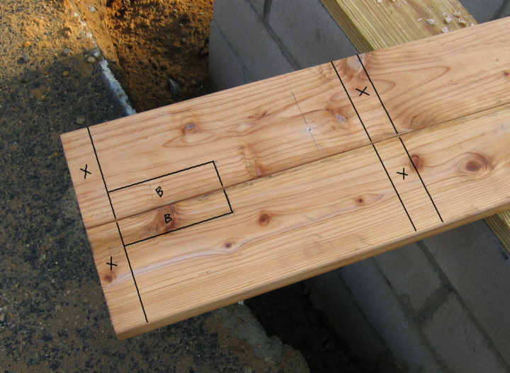 The top and bottom plates have been lined up and marked using a carpenter's square with stud distances. X for regular stud, K for king stud, J for jack stud, C for cripple stud, B for corner block (photo enhanced to show detail):