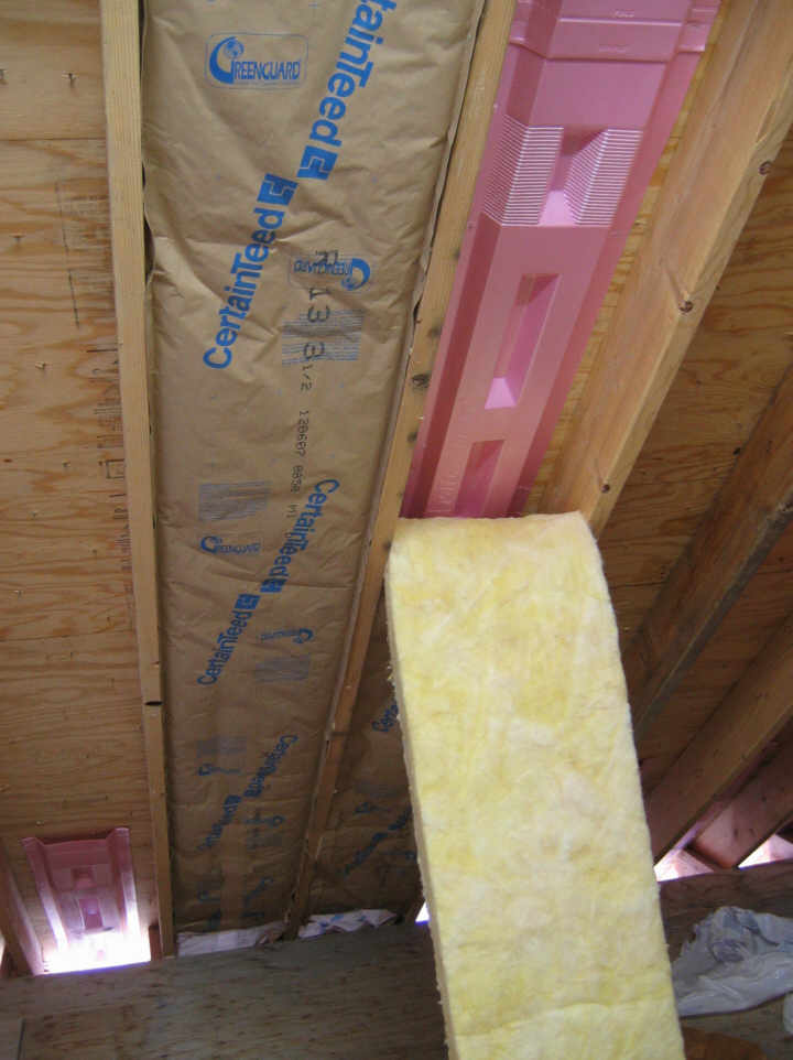 The insulation is cheapest in 32' rolls. This is perfect for the 16'-long rafter spaces. Unroll, cut in half, staple in place. Easy but not fun. I wear a mask, cap, gloves, overclothes so I don't bring fiberglass into the house: