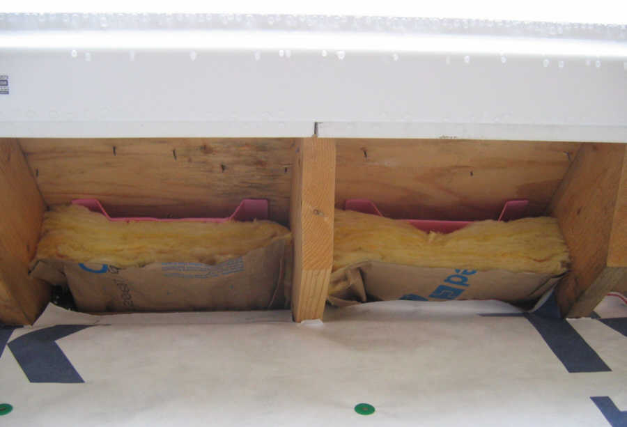 Outside, looking up into the soffit space between the wall and gutter. The rigid foam lets air get to the ridge, the fiberglass stops air from getting into the building: