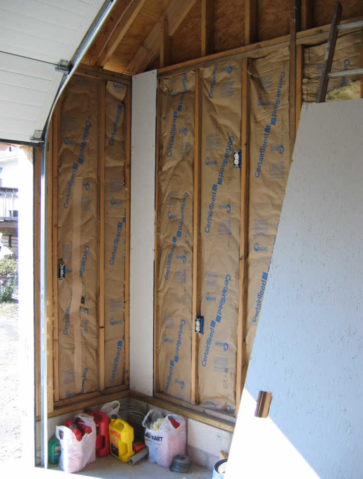 March 1. The garage passed the framing inspection last week. Now I can close up the interior walls. I started with an easy section, no outlets, switches or windows. First staple up some insulation:
