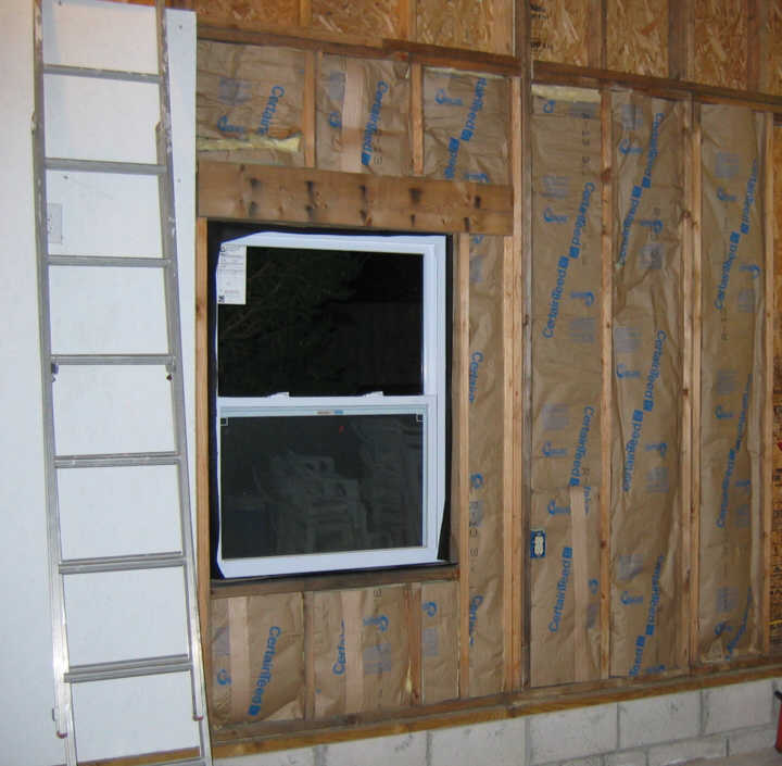 The window area has many little stud bays. I cut and fit insulation into each bay: