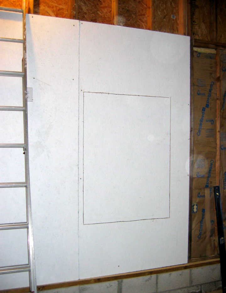 For the window opening, I measured distances like I did for exterior sheathing. I screwed the panel to the wall, drew lines on the panel, then cut out the window with the circular saw.
