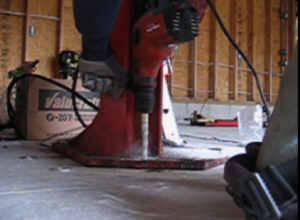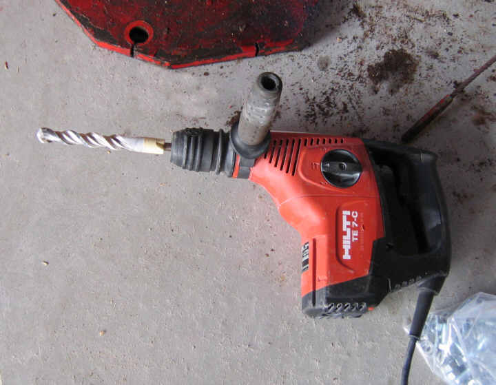 Then I went shopping. I bought wedge anchors and rented a hammer drill to drill 3/4" diameter holes 4 1/4" deep in the concrete. Here is the drill: