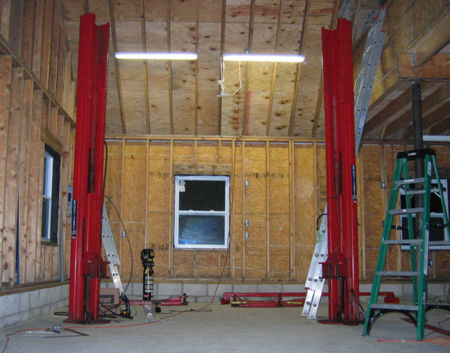 January 30. The lift is wired to the panel, and the panel has power from the house (see the electric page). The lift has power! It's working but only just. I have to adjust cables, fill the reservoir, etc., before I put a car on it.