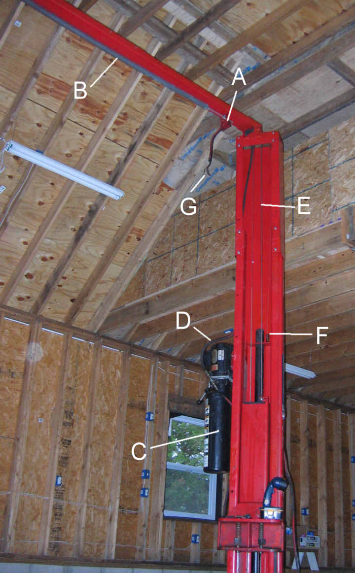 January 13. The lift is almost assembled. In this order, I hung the safety shutoff switch (A) and shutoff bar (B). I bolted on the power unit (C). I ran the hydraulic hoses (D) and attached them to the power unit. I attached and tightened the equalizing cables (E). I ran the safety lock release cable (F). I still need to wire up the electric (G) and attach the lift arms.