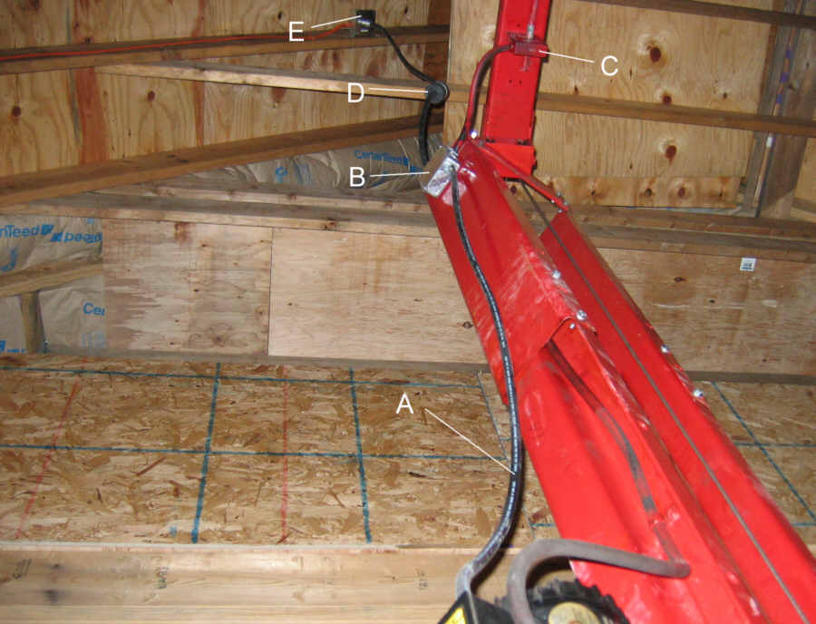 The lift is wired up. Looking up towards the ceiling in the picture below, "extension cord" type 10-3 wire (A) goes from the motor switch to a junction box (B) into which is also wired the safety shutoff switch (C). From the junction box, the wire goes to a locking 3-pronged plug and jack (D), then up to the a metal ceiling box with strain relief (E), 10-2 romex goes down the rafter to the wall: