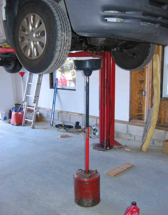 ...and oil change. The guy who sold me the lift gave me an old oil drain. The telescoping tube brings a wide basin up to catch oil from the drain plug and filter. You can see my home made version in the background. It works, but this metal one has a wider basin and is more easily adjustable.