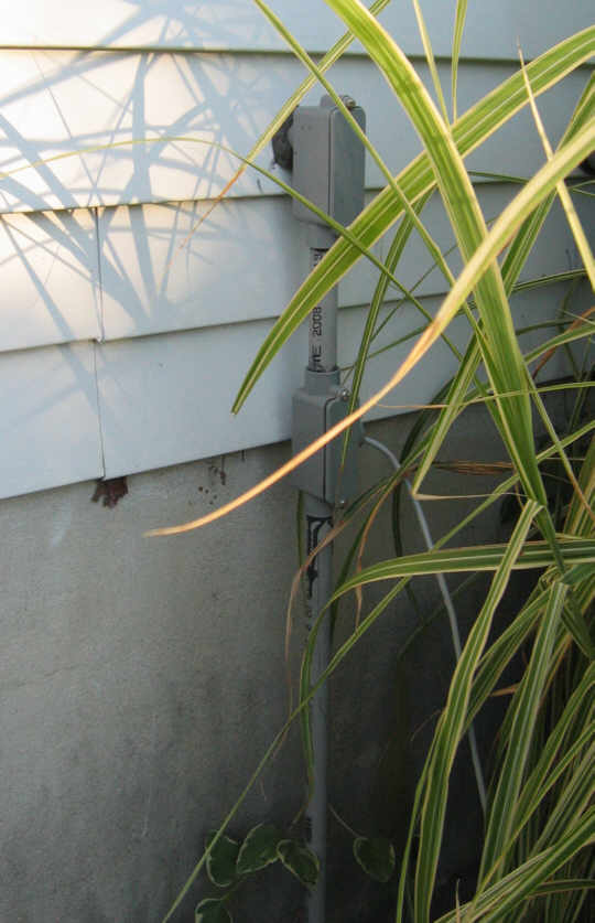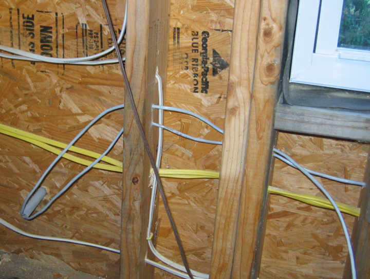 I should have run phone lines through the big conduit, or maybe not since there may have been interference along those big aluminum wires. Since I haven't closed up all the stud bays yet, I decided to bring phone lines in through the back wall.