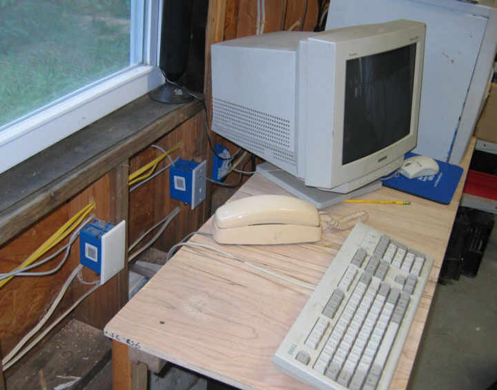 Phone lines in front, the coiled wire in the back will eventually hook up to the computer.