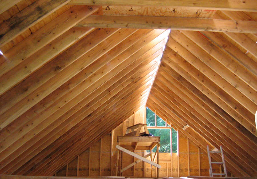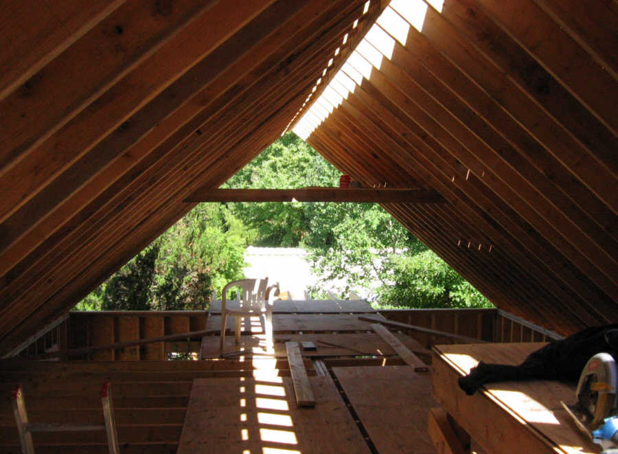 Upstairs looking south. You can see the stool I made on top of the platform. The top of decking near the ridge can be nailed when standing on the stool: