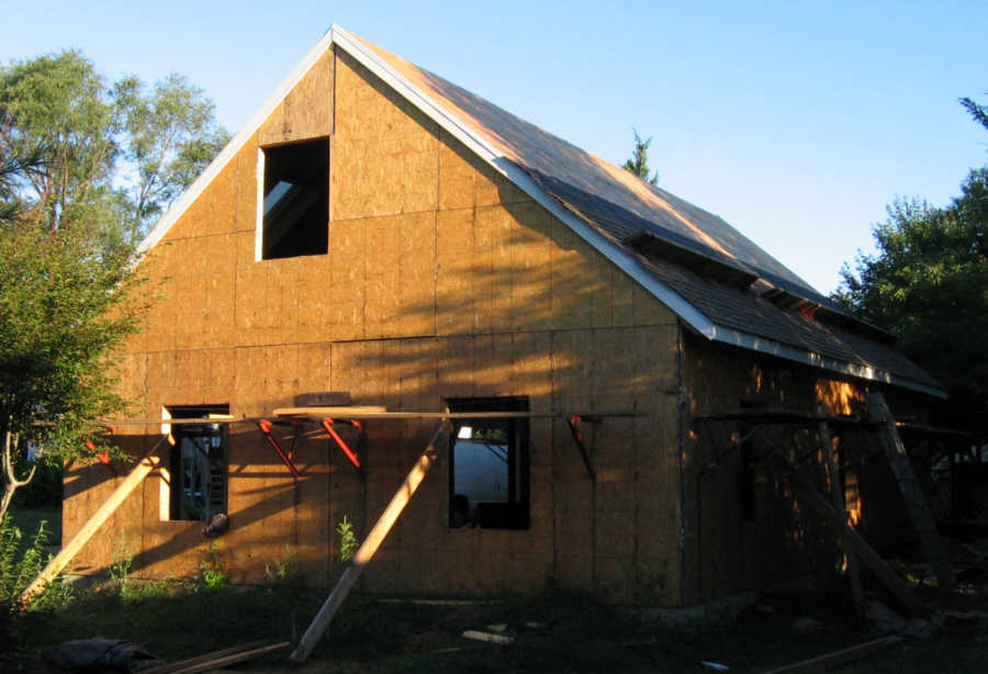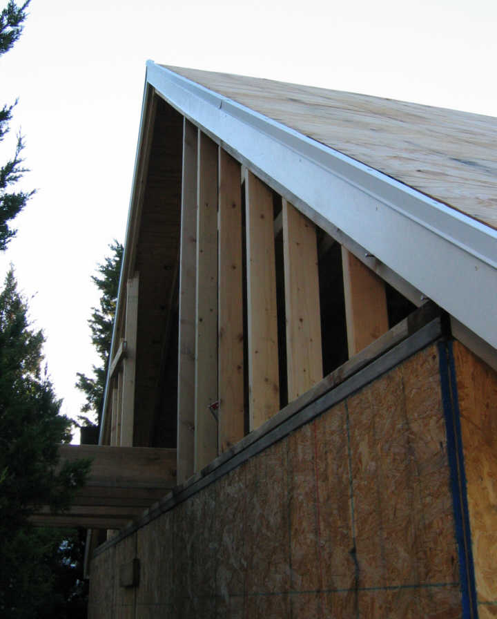 September 15. It rained all night and into the morning so I had to wait for the roof to dry up. I nailed some studs in the north gable end wall. This picture also shows trim detail: