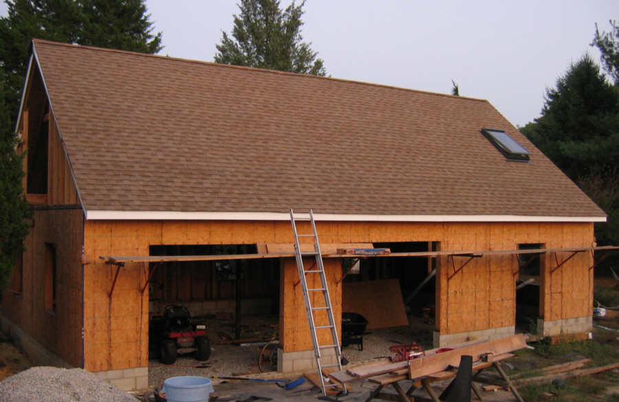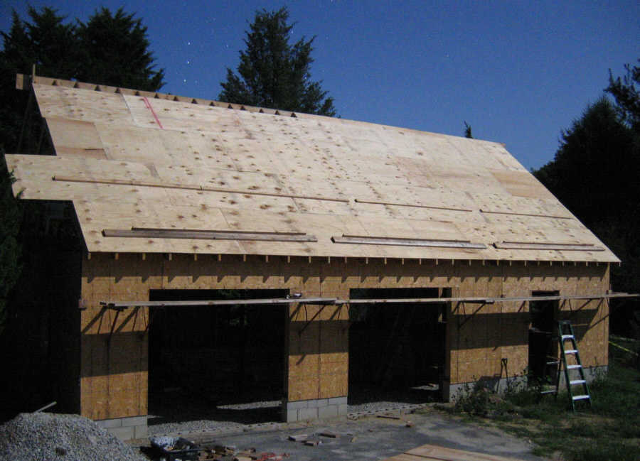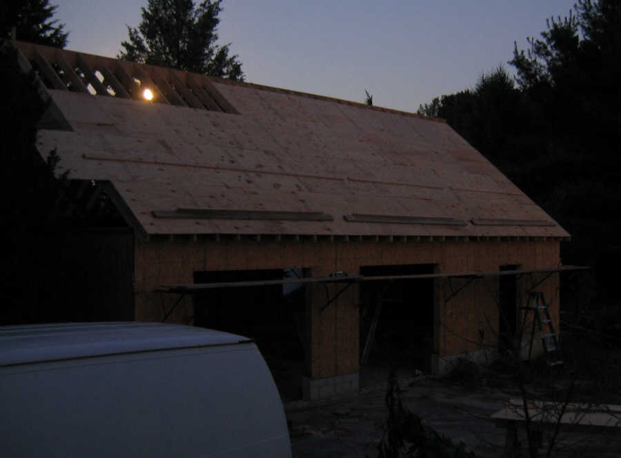 August 29, 3:30 AM. Orion rises over the garage, under a bright moon. I have sheathed over the skylight hole. I will cut it out later with my cordless circular saw.