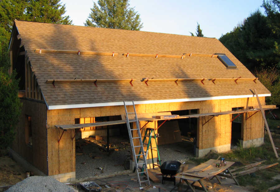 September 2. It took two days to nail four courses of decking on the east roof, less than half the time it took for the west roof. Live and learn. This picture shows roof jacks at the bottom of the roof. Above the jacks, we reused the wide cleats from the west roof. Still lots of trimming to do: