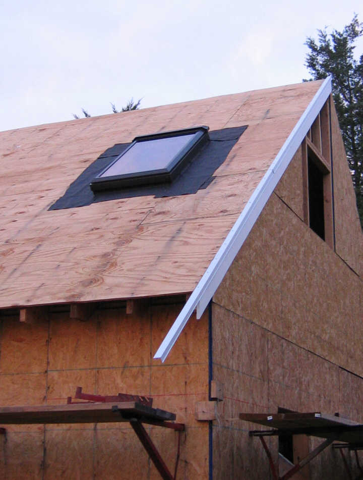 September 9. Some details need to be attended to before the shingles go on. Skylight installed, shrouded with tar paper. Subfascia (1x4 pine board) and PVC rakeboard is nailed to the end rafter, flush with the plywood decking. Then white aluminum drip edge is nailed to the subfascia.