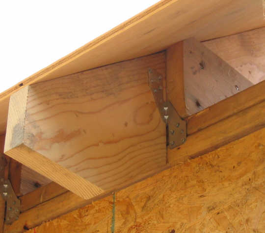 August 25. Before I could nail on any decking, I had to attach hurricane ties to each rafter and nip off the tip of the joists to allow for the decking. This picture, taken after the decking was installed, shows a tie and the nipped joist: