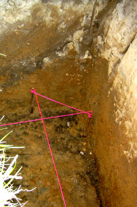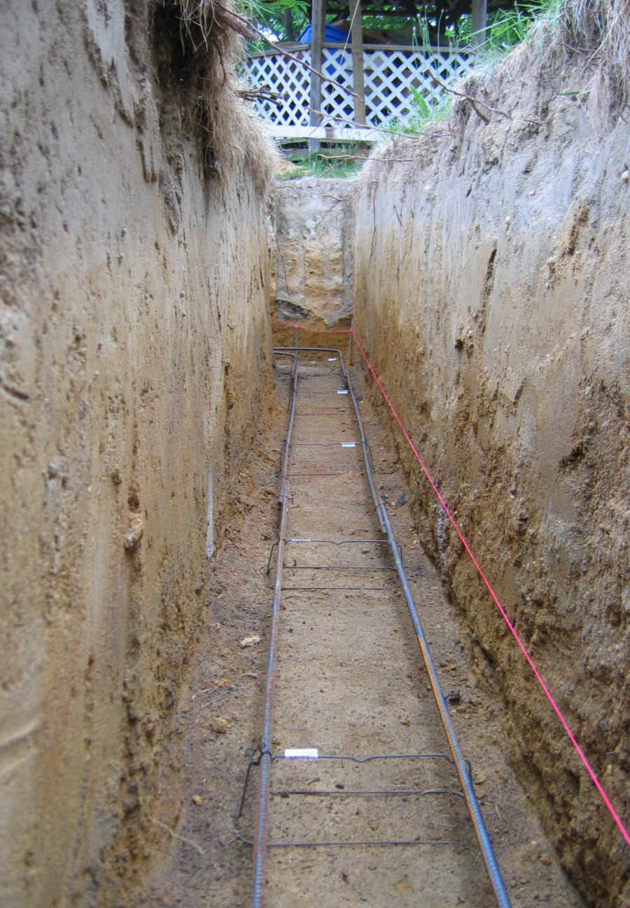 The line level did not appear to be as reliable as the water level. A small level showed that the strings were true after some slight adjustments. Then I ran the lines along the trench walls so I would have room to scrape the bottom of the trench where necessary: