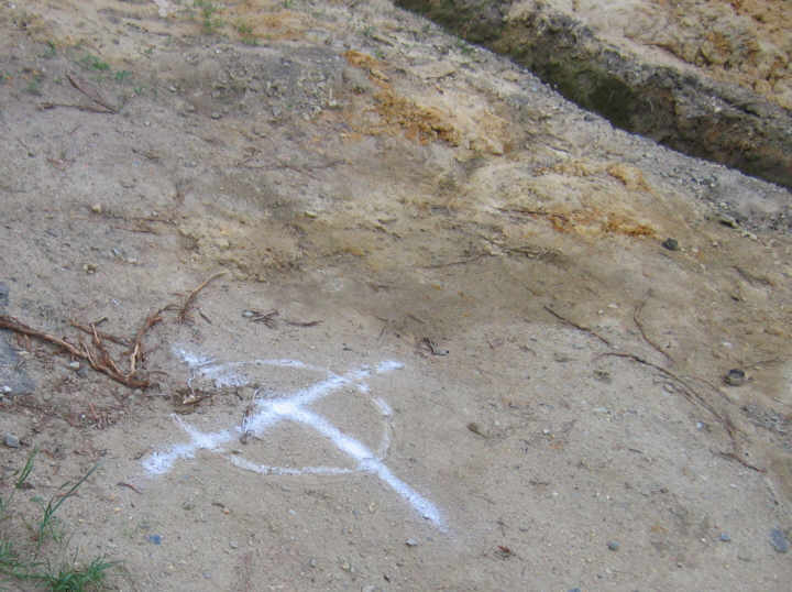 The trench passed inspection, but I couldn't get concrete delivered this weekend (Memorial Day) so I dug the holes for the center piers. X marks the spot: