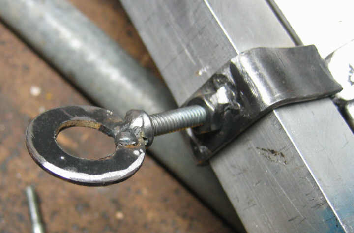 I drilled a hole in the strap and put a 1/4-20 nut over the hole. Ready to weld: