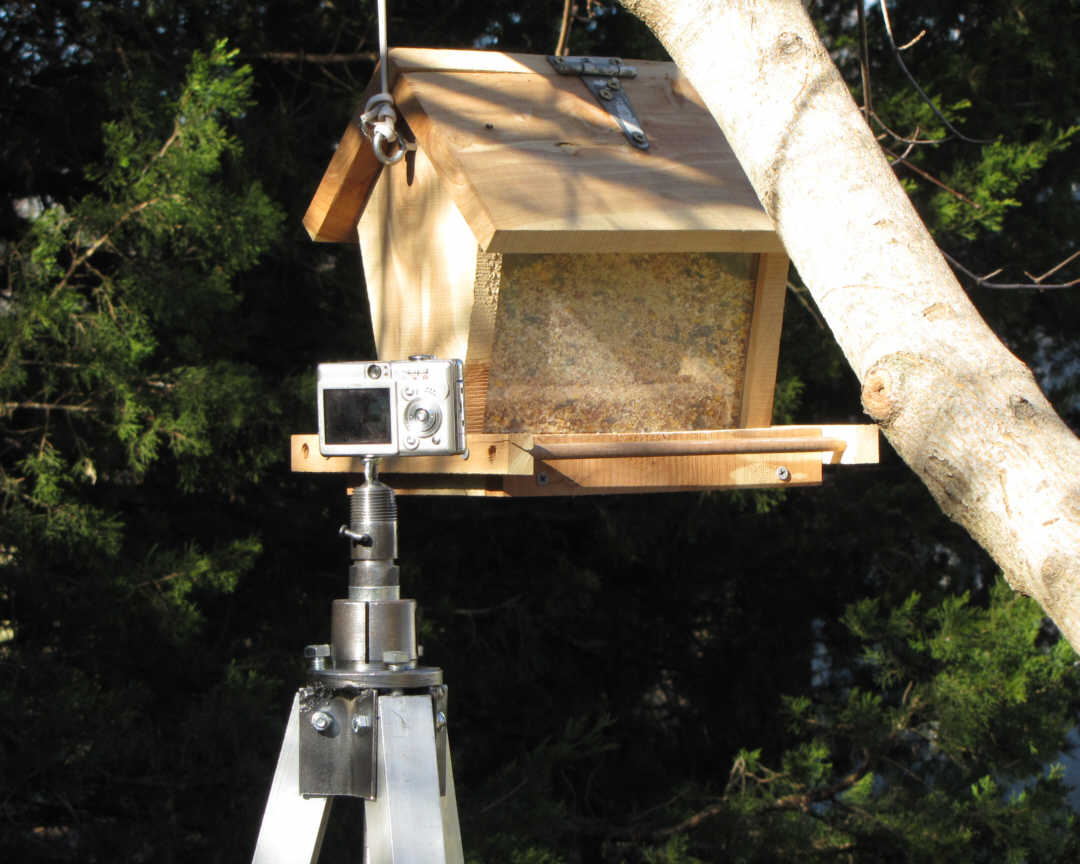 Here is a solution. Put the Canon SD400 on a tripod near the feeder and program it to take a picture every 10 seconds using a CHDK intervalometer. See the CHDK website for details.