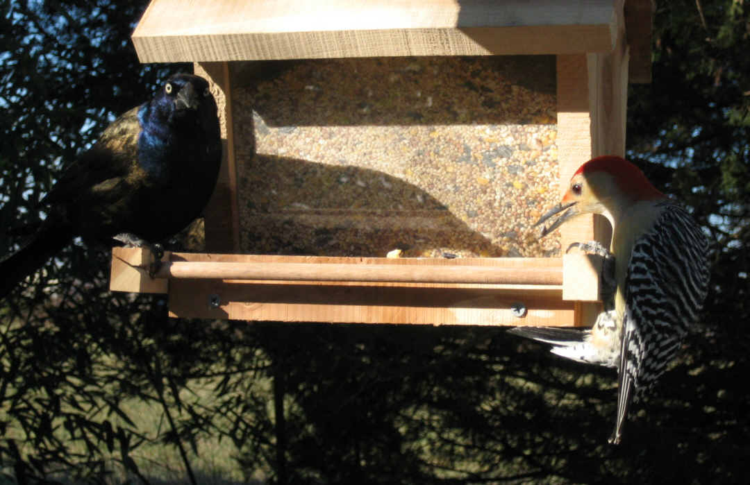 In December 2010, I built a cedar bird feeder from a plank of cedar cut from a tree in my yard (see Clearing the Land on the Garage pages). Here are the pieces during assembly. I got the instructions where I get instructions for everything, off the internet: