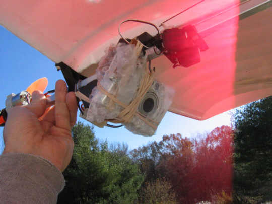 A Canon SD200 digital camera (115 grams empty) is tied to the plane at its center of gravity using several rubber bands.