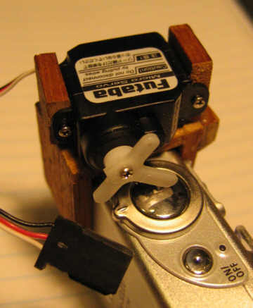 I thought it might be useful to be able to push the shutter using the transmitter, so I made a wooden frame to hold a servo: