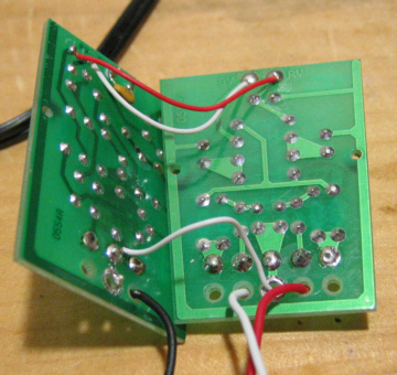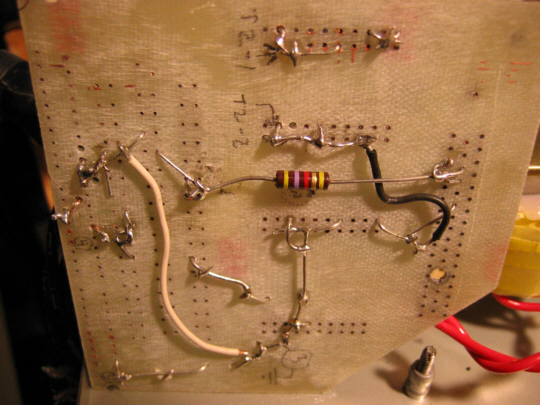 Using the circuit diagram as a guide, I mounted the diodes (1N4004's), resistors and capacitors on a scrap piece of circuit board. Here is the underside of the power supply circuit board.