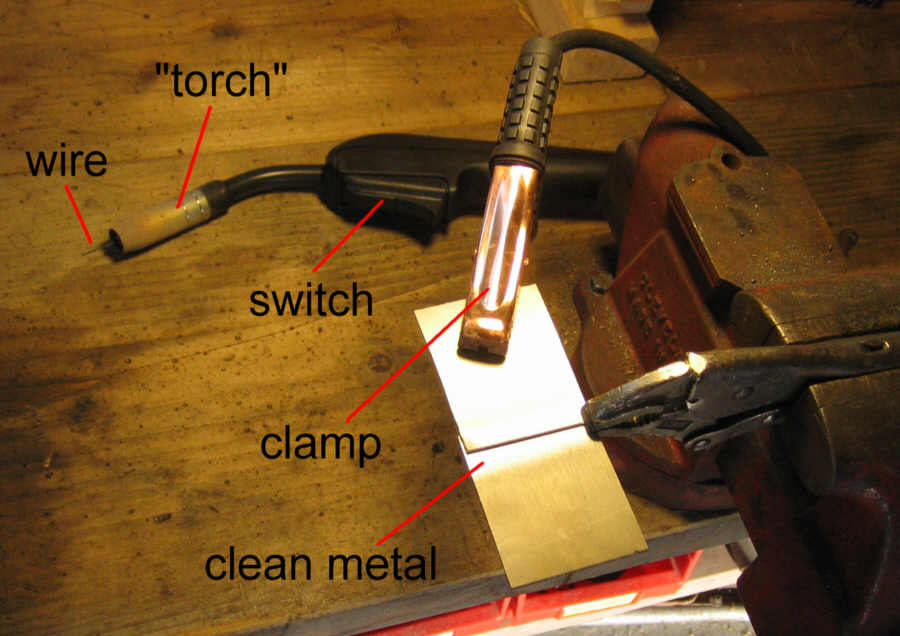 The "torch" has a thin hollow wire running through it. The wire contains flux which vaporizes when heated thus shielding the weld with gas so that the hot iron doesn't oxidize in the air. When the switch is pushed, the wire feeds out at a speed determined by a dial on the front panel. At the same time, the wire becomes electrically "hot". The copper clamp provides a path to complete the circuit so an arc forms at the wire tip and melts the wire. The heat melts the iron piece thereby fusing it all together.