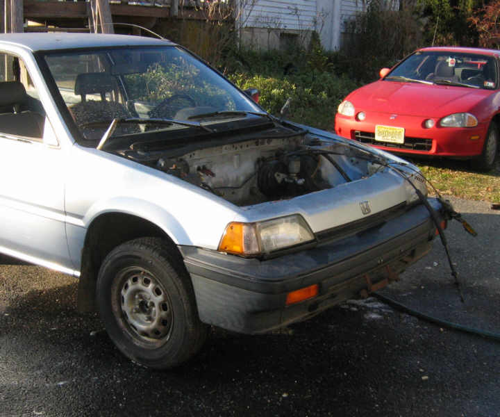Here is the car outside, where I gave the engine compartment a little bath. The front end is sitting high without the engine and drive train: