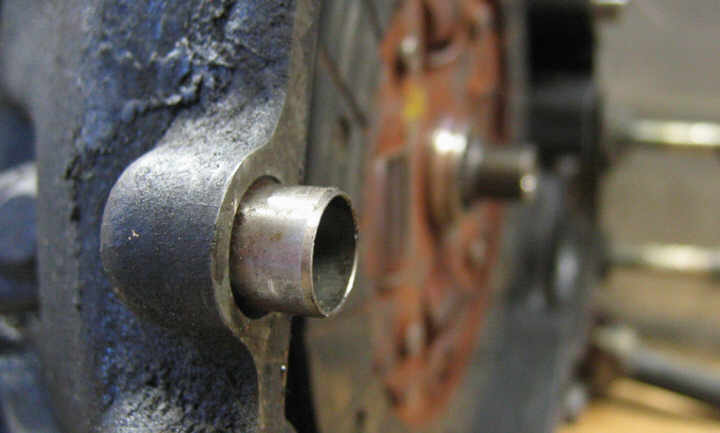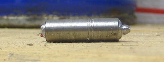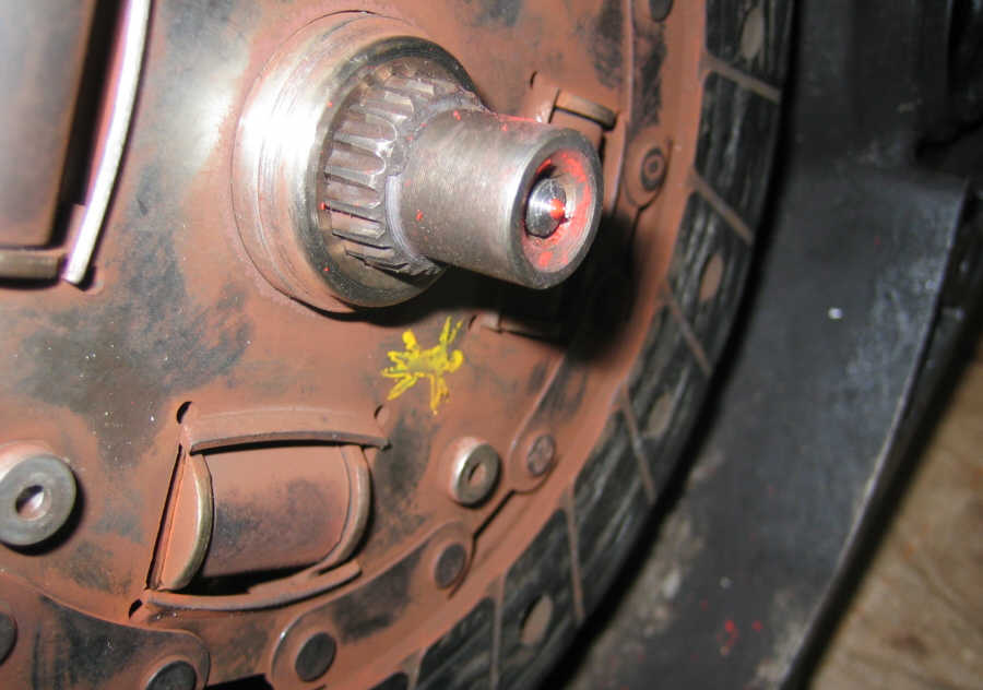 Now I can find the center point of the transaxle shaft. I used my handy caliper to measure the inside diameter of the hole in the pilot shaft and turned an old bolt down to the correct diameter on the lathe. Then I cut a little tip at the end on which I will dab some paint: