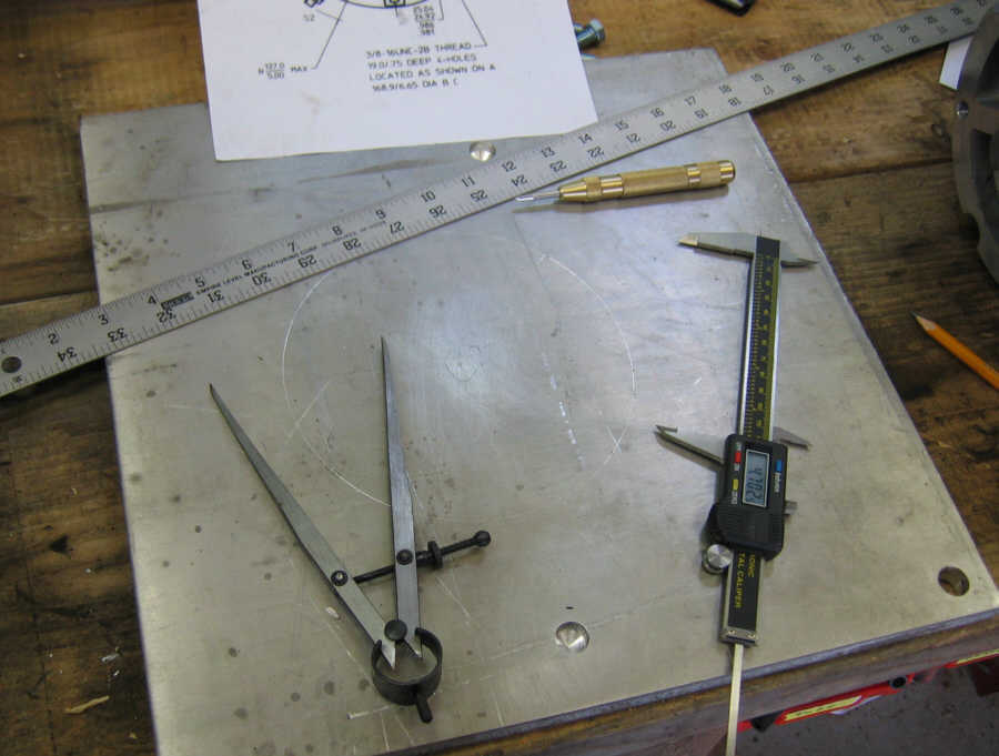I center punched the dot and got out my measuring tools. Using the engineering drawing of the motor to get the correct radius, 3.325 inches, I drew a circle centered on the red dot punch mark. I used the properties of a right triangle to figure out the distance between the bolt holes: 4.702 inches.