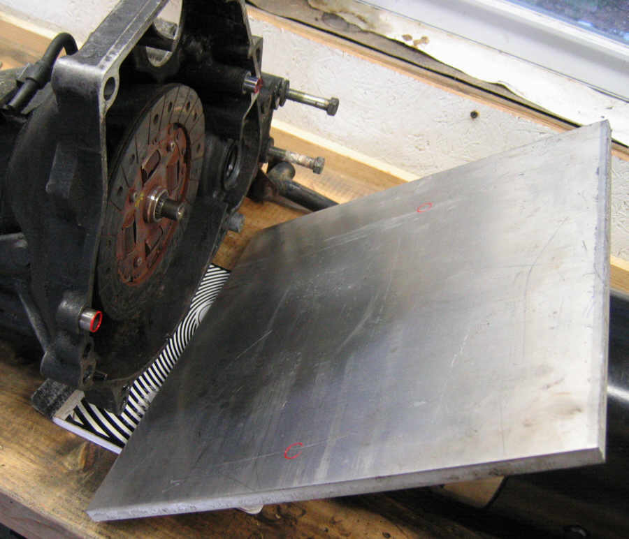 November 22. I got a 1/2" thick 15" square piece of aluminum at Fazzio's for about $3 a pound. There it is behind the transaxle: