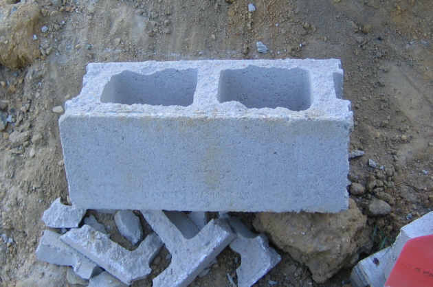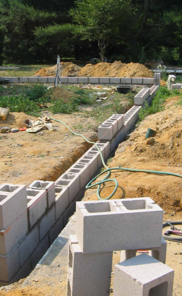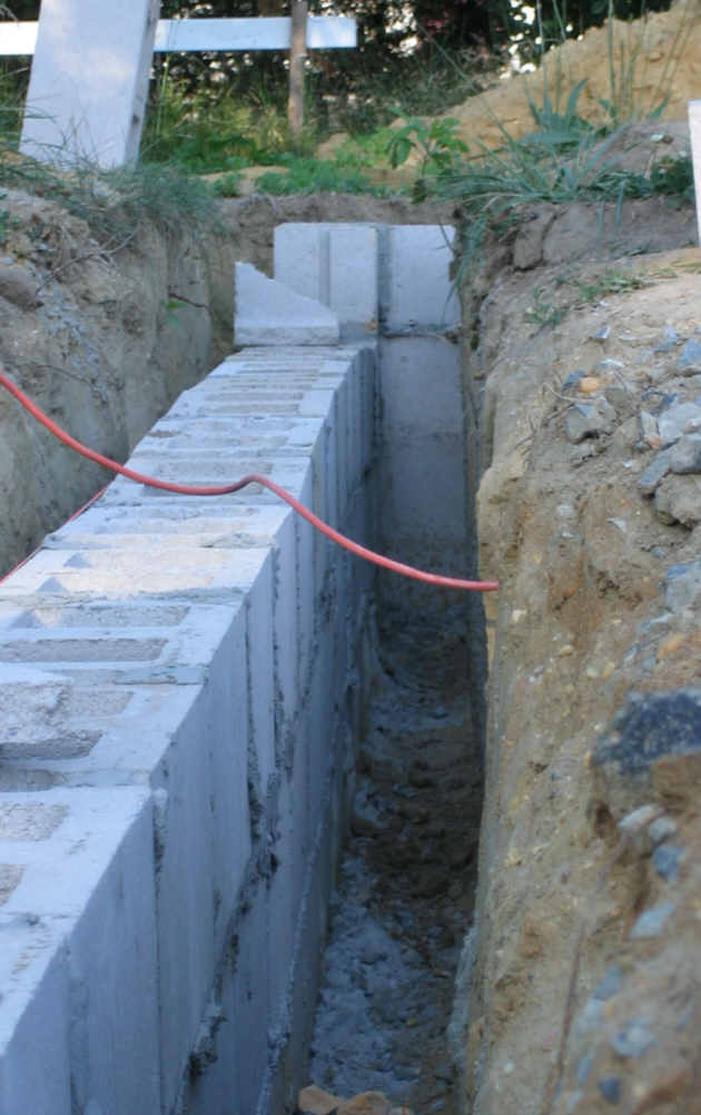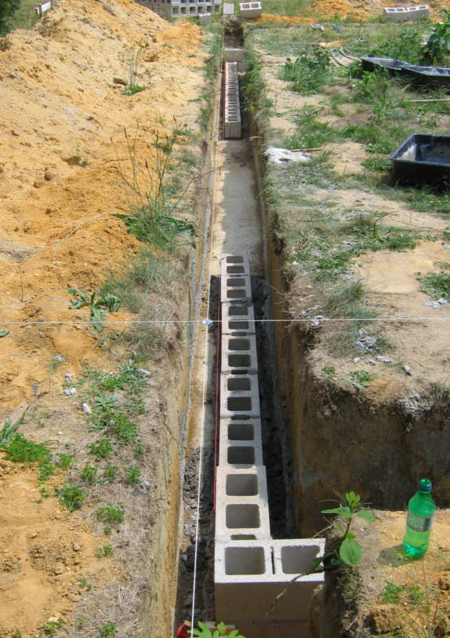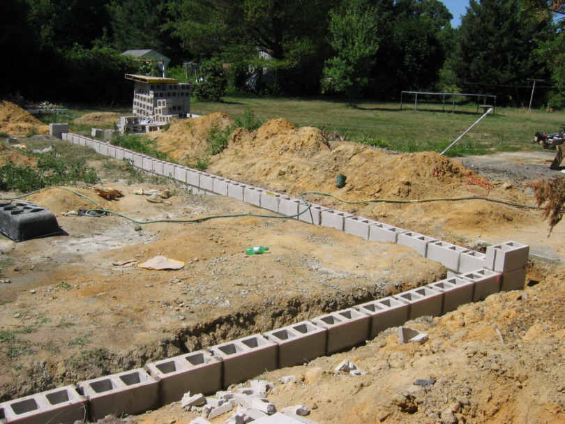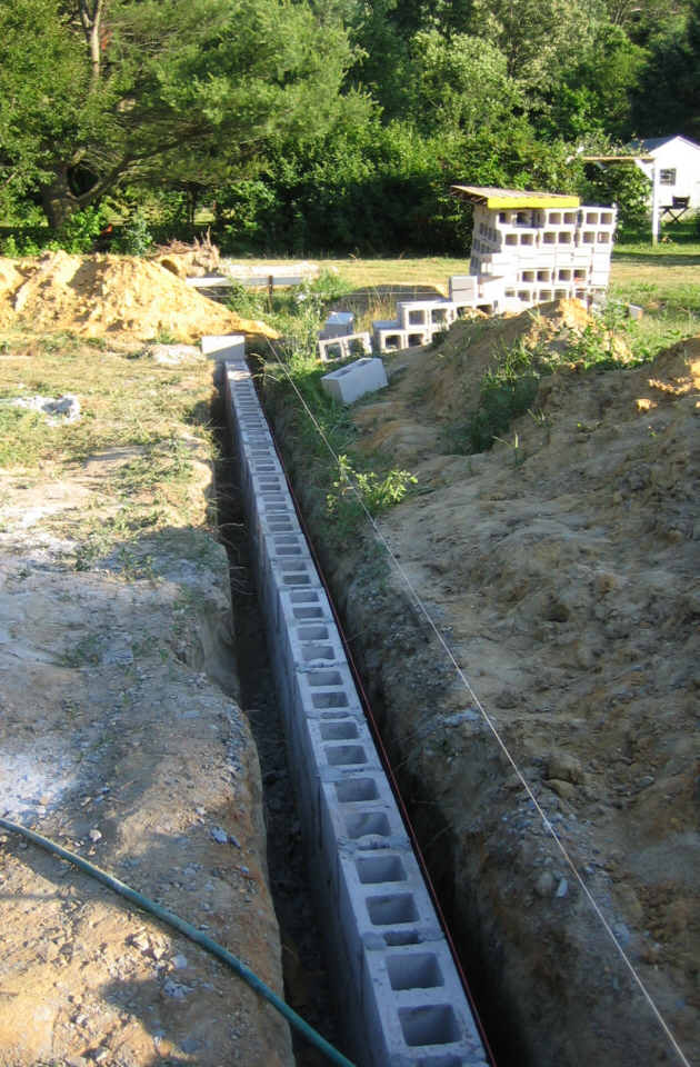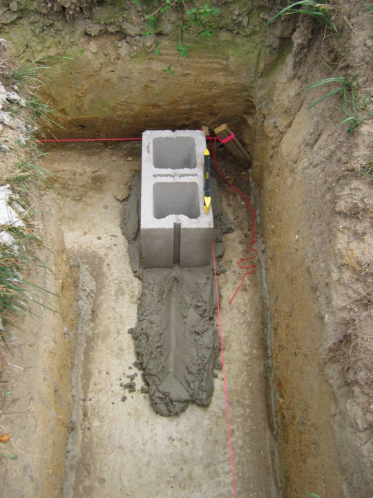These blocks set the mason's line 3/8" from the side of the blocks. This is far enough so that squeezed mortar does not disturb the line. Each block will be set parallel to this reference line. When pulled tight, wall height can be checked also. Here is the famous east trench in progress: