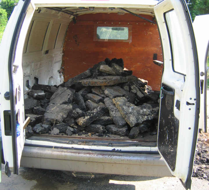 Notice that all the asphalt is gone. We moved it in the old Ford van in two loads to a local recycling yard. Heavy stuff, glad to be rid of it. Here is the van full of asphalt: