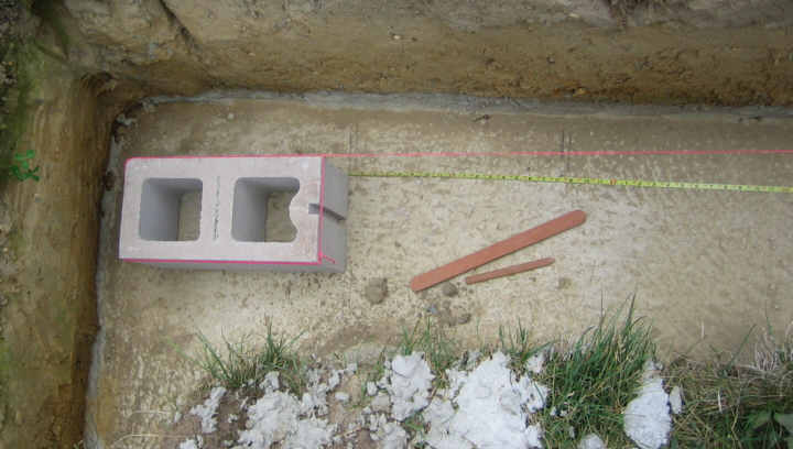 To get an idea where the first course of blocks would go, I snapped a blue chalk line between points defined by a plumb bob hanging from mason line intersections: