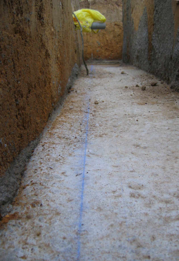 June 23. Three full courses done, blocks still below ground level. Here is the west trench in the afternoon sun:
