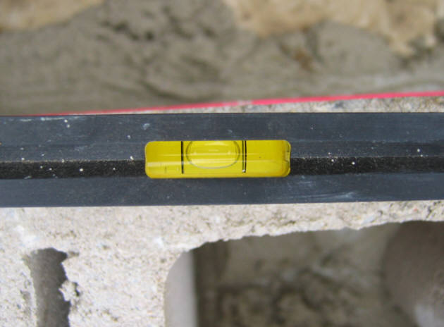 Useful tools shown: concrete hoe in the tub, yellow level, trowel. Notice the staked red mason's lines defining the corner of the building. I used these lines instead of a chalk line because chalk lines would be covered with mortar. The mason's lines showed me where to set the corner blocks and the first couple of blocks on each side of the corner.
