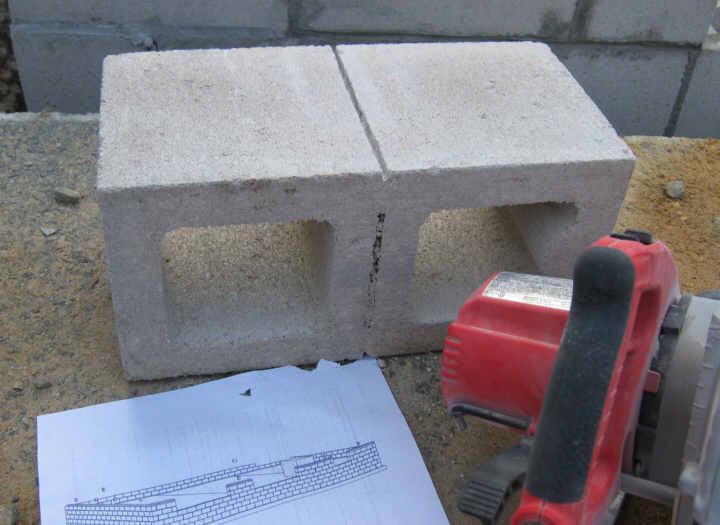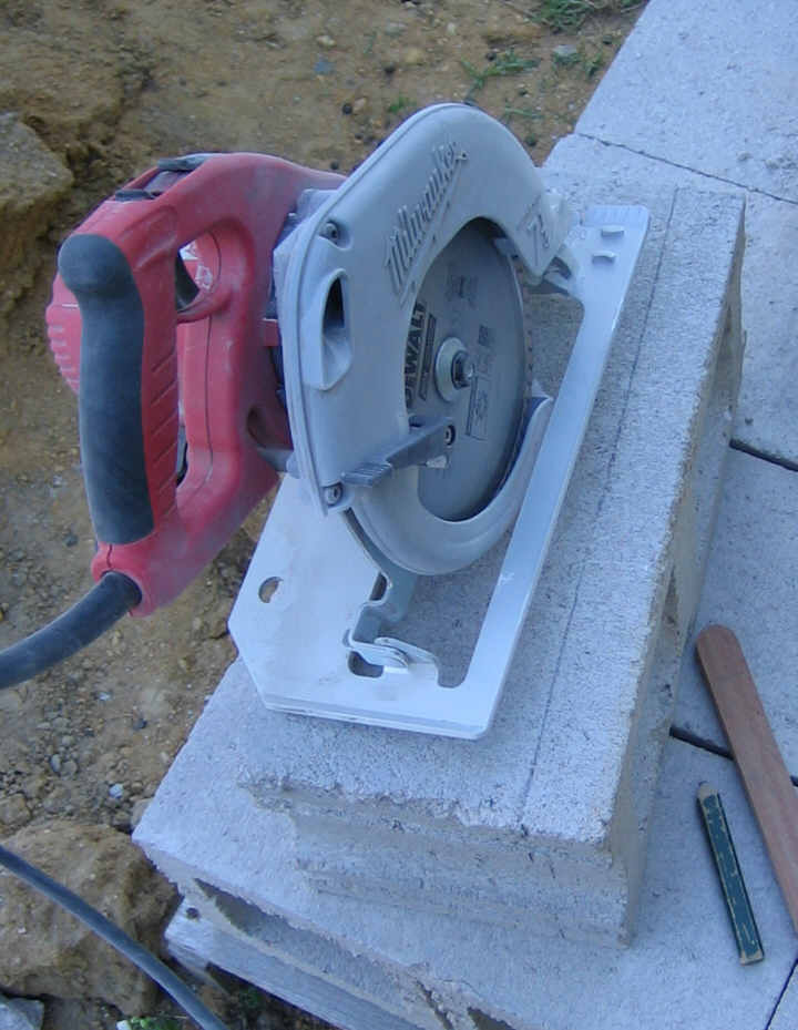 I hoped this would smooth out as we added blocks but the initial hump in the footing was too high to compensate with mortar. Bring out the saw with diamond blade: