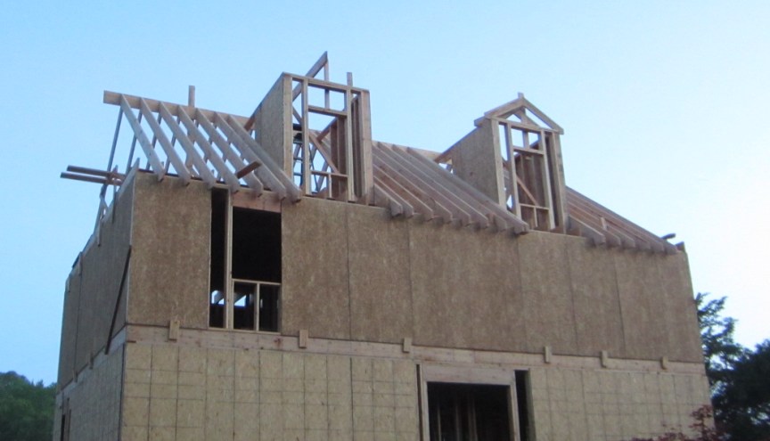 We put up the ridge board for the other dormer. Here are the dormers at the end of the day from the front: