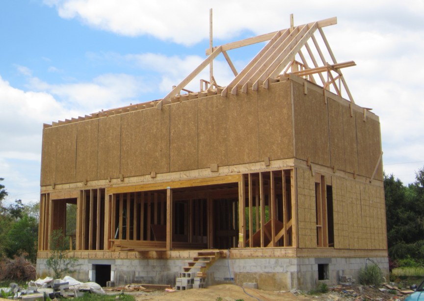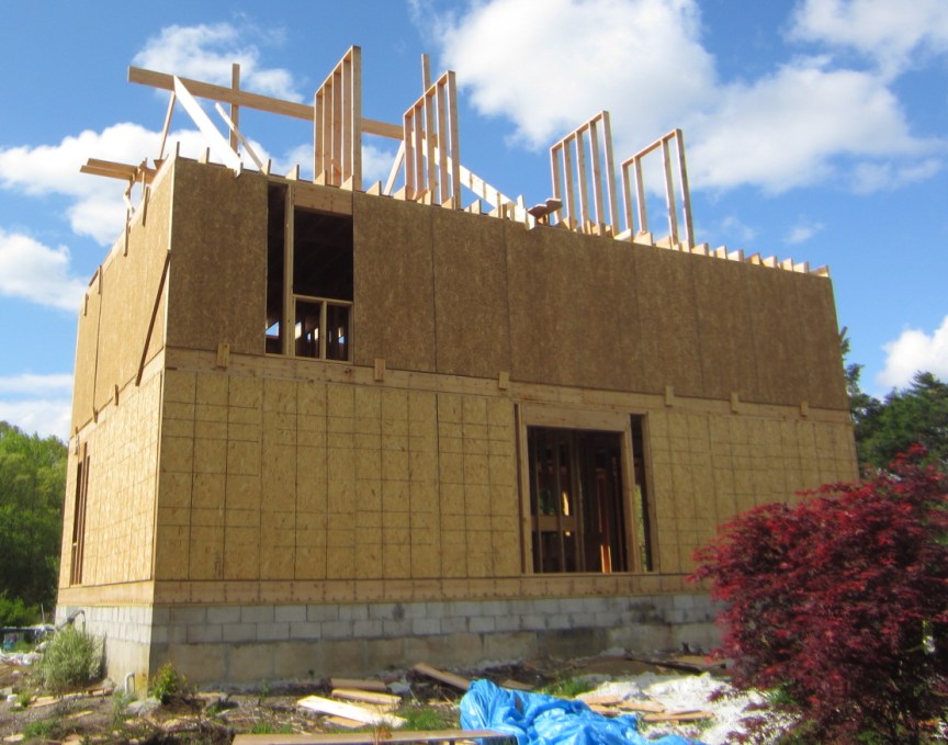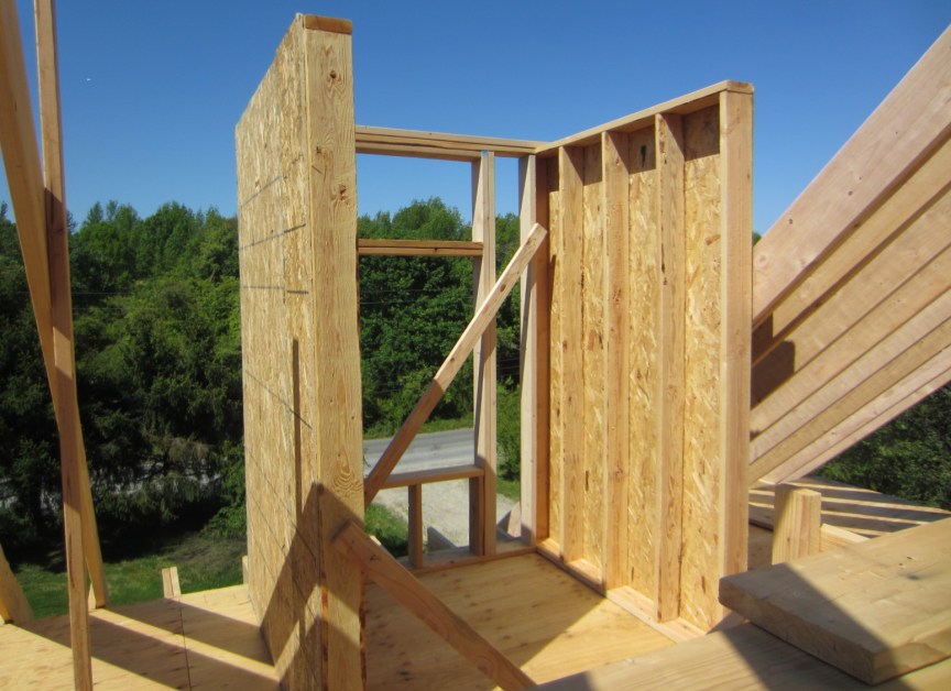 May 5. I built 3 more triangular frames, for the other dormer walls. We measured and cut OSB sheathing, nailed it to the triangular wall frames and nailed the walls to the top plates, to the adjacent wall and to the rafters: