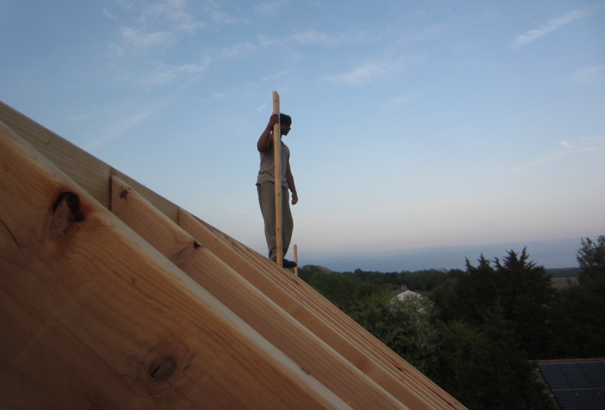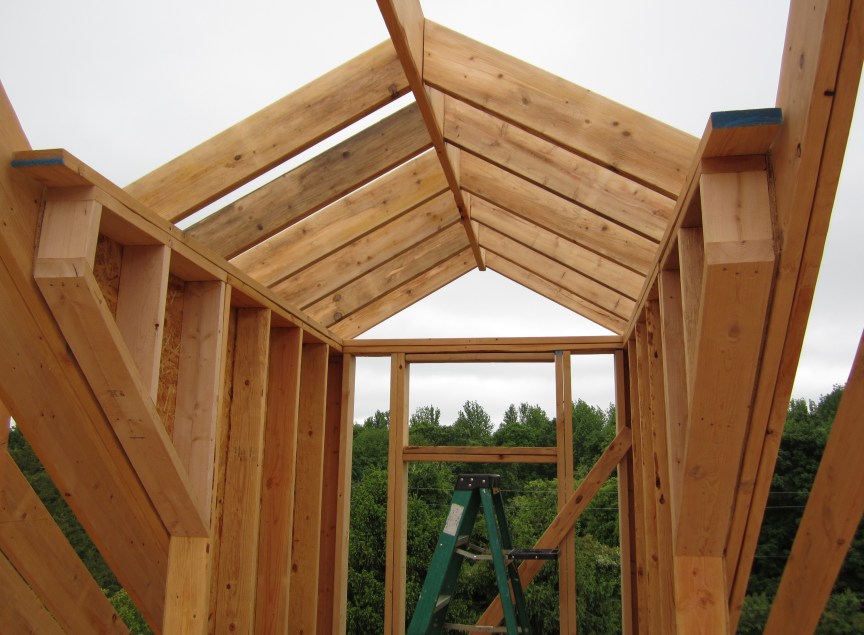 April 28. The second half of the ridge board goes up, and more rafters :