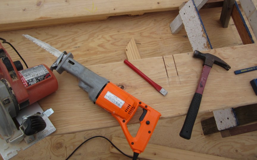 May 6. A bit of fun at the edge of the third floor: installing fly rafters. I took one of the gable end rafters and marked it every two feet with my carpenter's square for a notch I will cut for 2x4 "lookouts." These will support a 2x6 rafter called a fly rafter that will stick out beyond the wall of the house. This picture shows all the tools required. The circular saw makes straight cuts, the reciprocating saw cleans up the cut so that it goes to the base of the cut...